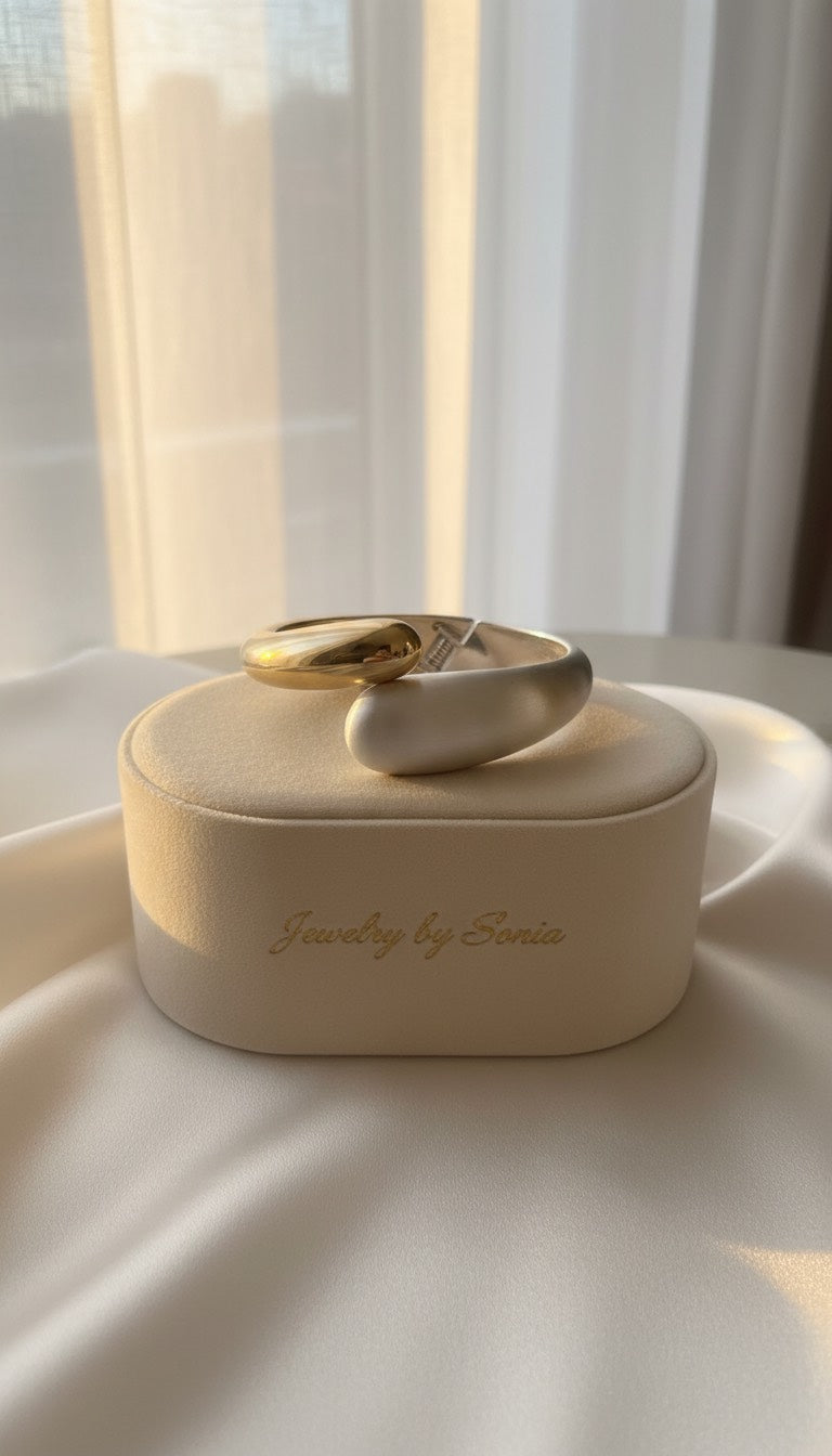 • Design : Manchette torsadée asymétrique (moitié dorée, moitié blanc mat), rigide pour un ajustement confortable.